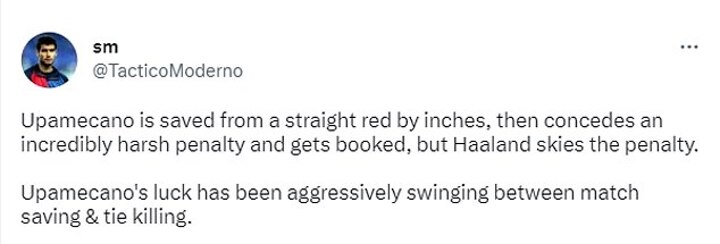 One user wrote: 'Upamecano is saved from a straight red by inches, then concedes an incredibly harsh penalty and gets booked, but Haaland skies the penalty. Upamecano's luck has been aggressively swinging between match saving & tie killing.'