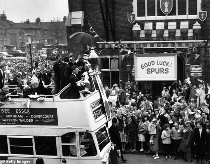 Bound by the spell are Steve Smith and Richard Blanchflower, sons of two Spurs scorers in the final against Burnley in 1962, bursting with excitement as they join the team to parade the trophy in London on an open-top bus.