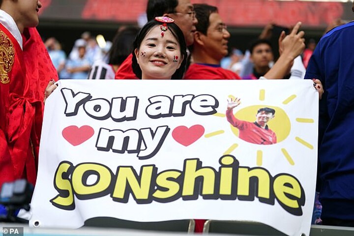 Meanwhile a pair of Korean fans were pictured holding a 'you are my Sonshine' poster adorning the Spurs star's face.