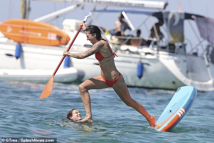 Hermoso, who netted three times in the tournament, can be seen doing her best to stay aloft on a paddle board.