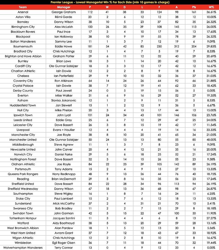 These are the managers who have recorded the lowest win percentages for each club who have played in the Premier League since its inception in 1992... and some names on the list will certainly surprise you.