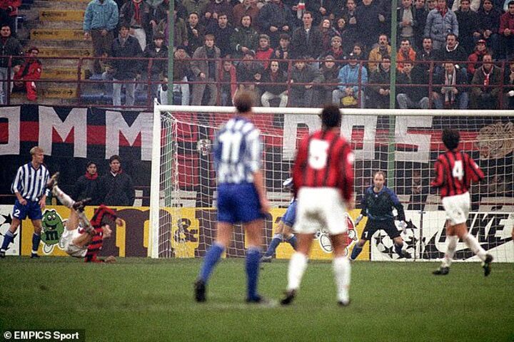 Stefano Eranio delivered the ball into the box for Holland legend Van Basten to execute an acrobatic overhead kick that saw him seal his hat-trick, four years on from his famous strike in the final of Euro 88.