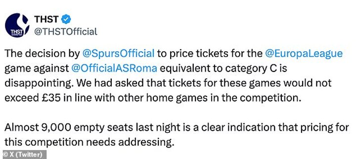 A statement from the fan group issued on Friday afternoon read: 'The decision by @SpursOfficial to price tickets for the @EuropaLeague game against @OfficialASRoma equivalent to category C is disappointing.