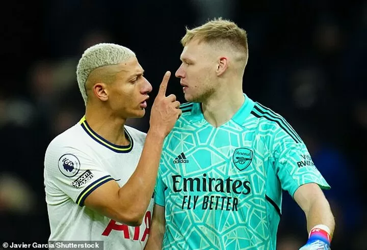 He was quickly confronted by Spurs' Richarlison - who appeared to push Ramsdale in the face - before the keeper was kicked by a Tottenham supporter.