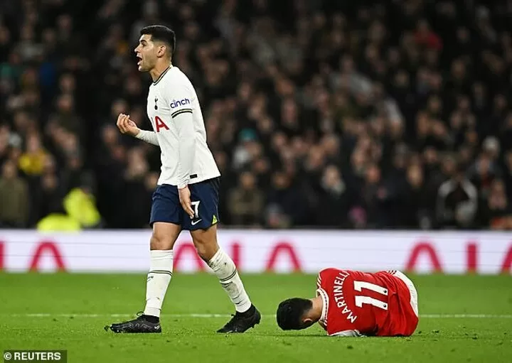 As tempers began to boil over, the Brazilian forward was seen ignoring Martinelli's offer of a hand-shake but the Spurs star has now apologised and asked his national team-mate to 'hug it out'.