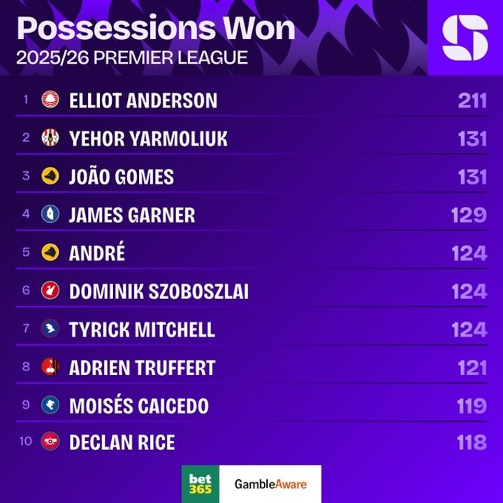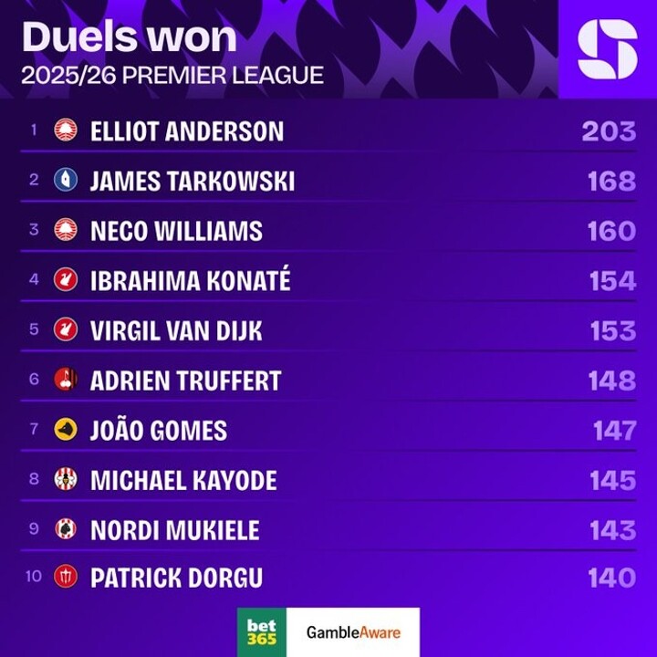 Squawka collects the latest information on duels and possession this season for every individual player in the Premier League, aiming to identify those who can capitalize on their physical benefits and secure their positions on the pitch. Elliot Anderson, without any doubt, is the frontrunner on the billboard. Starting in 25 matches for Nottingham Forest, Anderson completed 211 possession wins—80 more than the second—and 203 duel wins—35 more than the second. To note here, Anderson is not a center back, but his stats on duels surpassed some very experienced center backs such as Virgil van Dijk and Ibrahima Konaté. Anderson is also talented at passing and creating opportunities. With data up to December 2025, Anderson was leading Moises Caicedo in passes into the final third and ranked high for progressive passes and shot-creating actions. For most of the time, he acts like the midfield engine on the field to connect the back and front lines of the team. Born in 2002, this year is already his 4th year in the senior team since he moved from Newcastle United U21 to the same team's senior team. The future of this youngster is far from predictable.