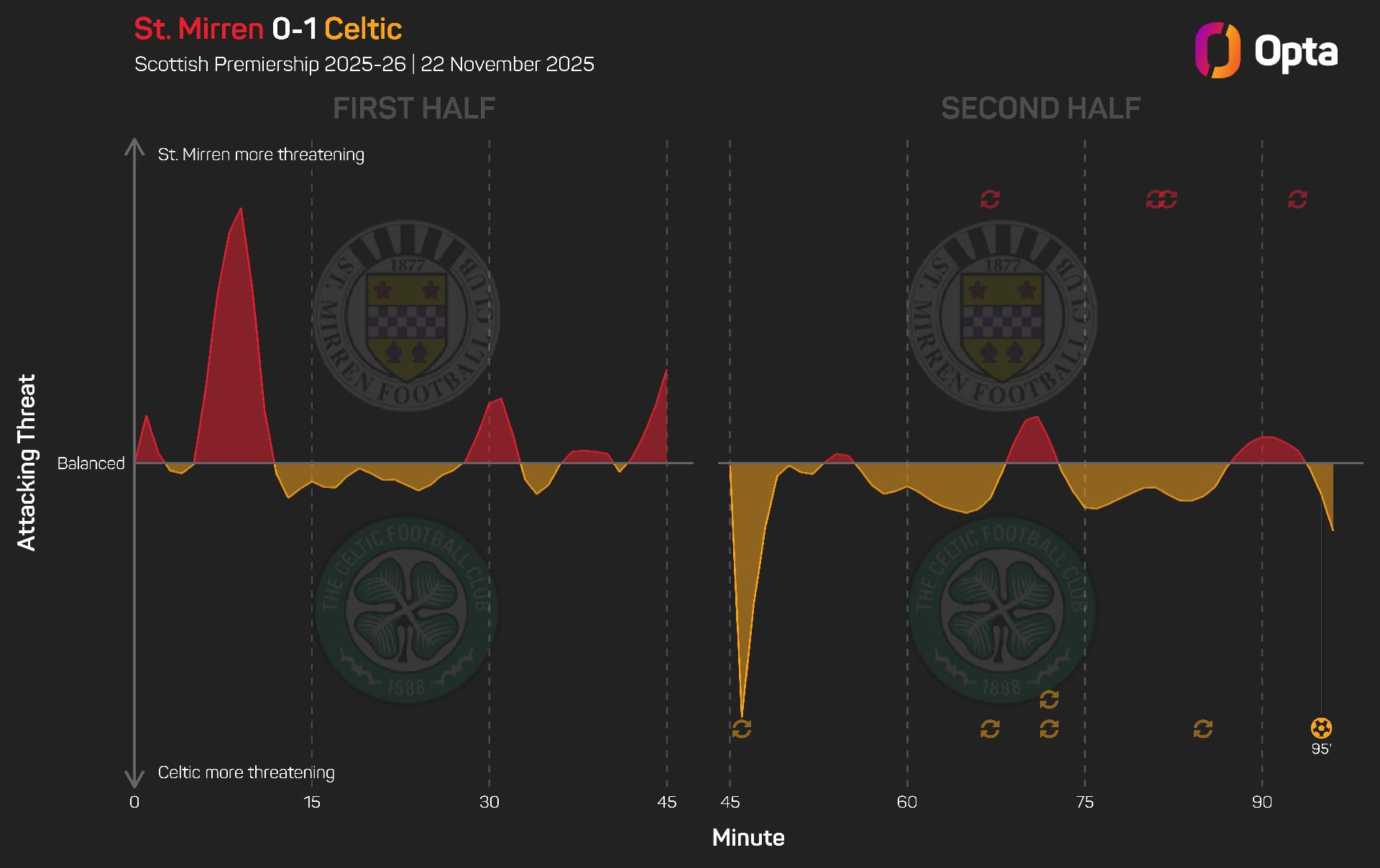 St. Mirren made Celtic uncomfortable from the off, with Conor McMenamin prodding just wide in the early stages then firing off a long-range effort that clipped the far post.