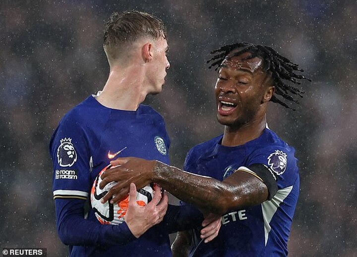 Summer signing Cole Palmer initially picked up the ball with the intention of stepping up to the spot, only for Raheem Sterling to take the ball off the 21-year-old.