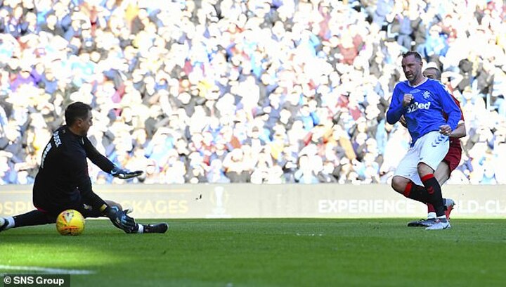 The 36-year-old turned a defender in the box and calmly slid the ball into the corner to make it 2-1 to Rangers Legends.