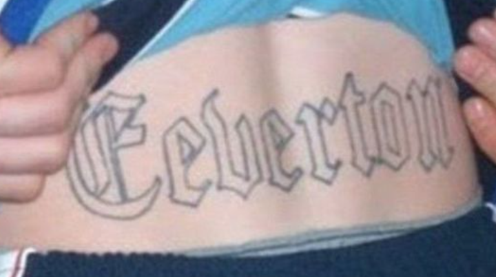 This lad supported Eeverton so strongly that he decided to get the club's name tramp-stamped on his body. But there's something wrong with how this has been done, isn't there?
