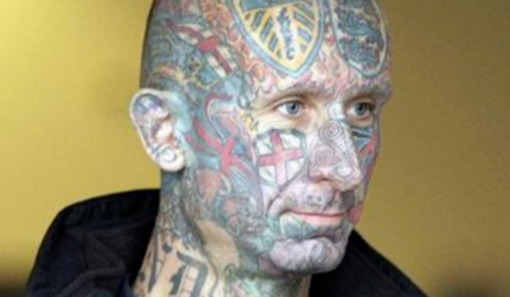 One plus point about this fella's ink is that he's not got his name tattooed on his head (well, at least it doesn't look like it) but he's decided instead to have England and Leeds United crests marked on his forehead.