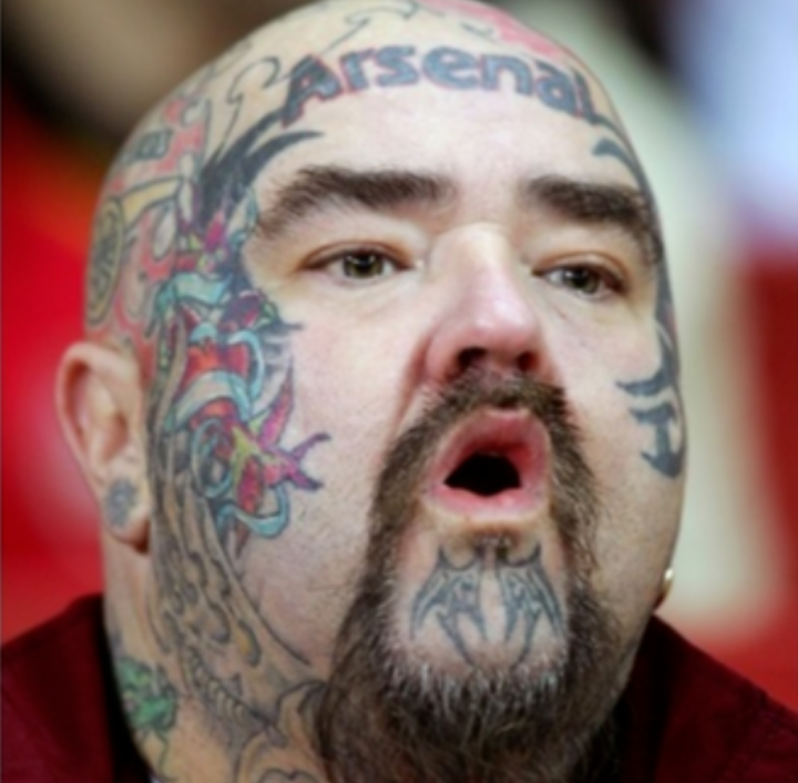 The Arsenal fan knows what's going on. Complete with a goatee and shaven head, the decision to go with his club's name right across his forehead and what looks like the club crest on the side is definitely proof that nobody loves the team more than him.