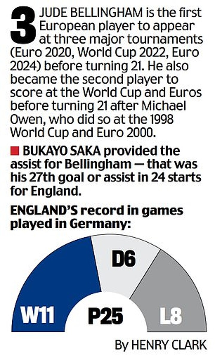 But this win was about Bellingham, who, to no one's surprise, was named man of the match. Watching him here felt like going back 20 years to the European Championship in Portugal when Wayne Rooney announced himself on the international scene like a force of nature.