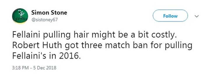 Twitter user @NikonPhil was part of a growing consensus after the match, tweeting: 'Fellaini should be banned, no excuses for the way he plays.'