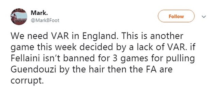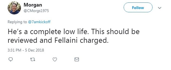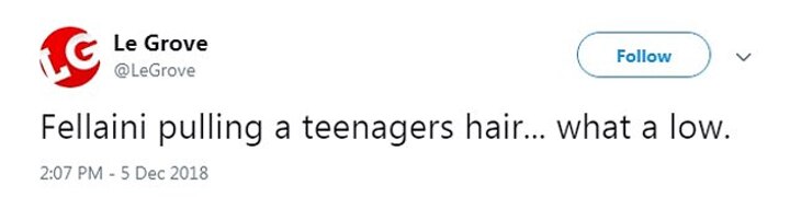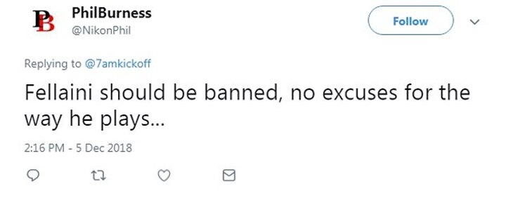 There was agreement from @CMorgs1975, who added: 'He's a compete low life. This should be reviewed and Fellaini charged.'