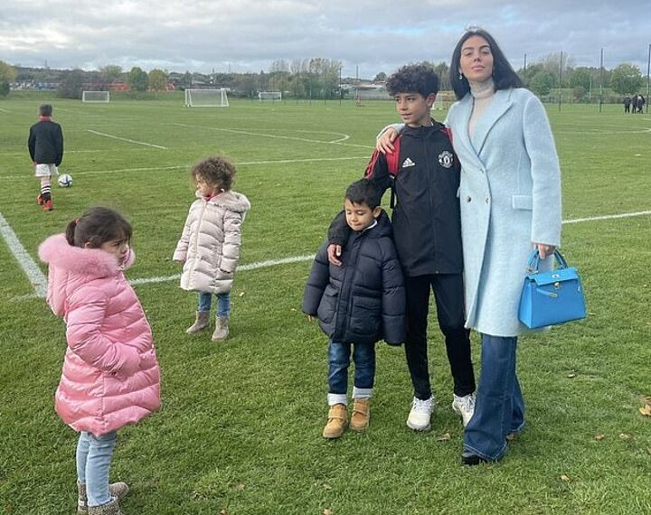 Georgina Rodriguez spent her Sunday afternoon cheering on Cristiano Ronaldo Jr - who was playing for the Manchester United academy team.