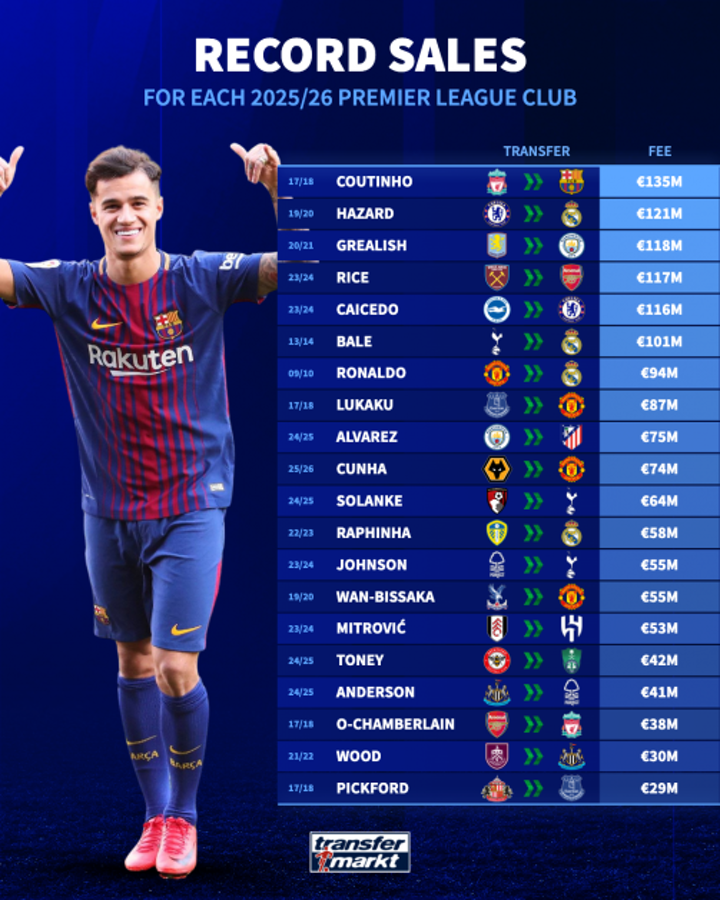 The 2025/26 transfer window is open and clubs have already been busy. The brief early window before the Club World Cup will close on June 10, but re-open six days later on June 16. Whilst supporters often spend these coming months getting excited about which new signings are being brought into the club, sorting out player exits and getting funds into the club can be equally as important. With this in mind, here at Transfermarkt we have calculated the record sales for every 2025/26 Premier League team based on the biggest fee brought in for a single player. Some of the results may be met with some stupefaction.