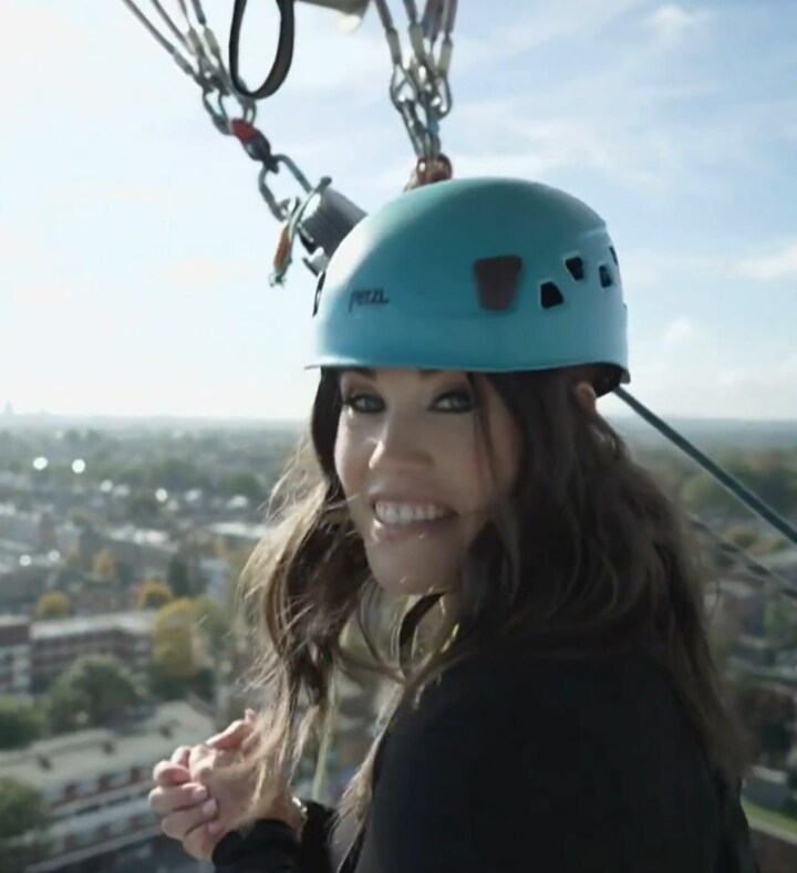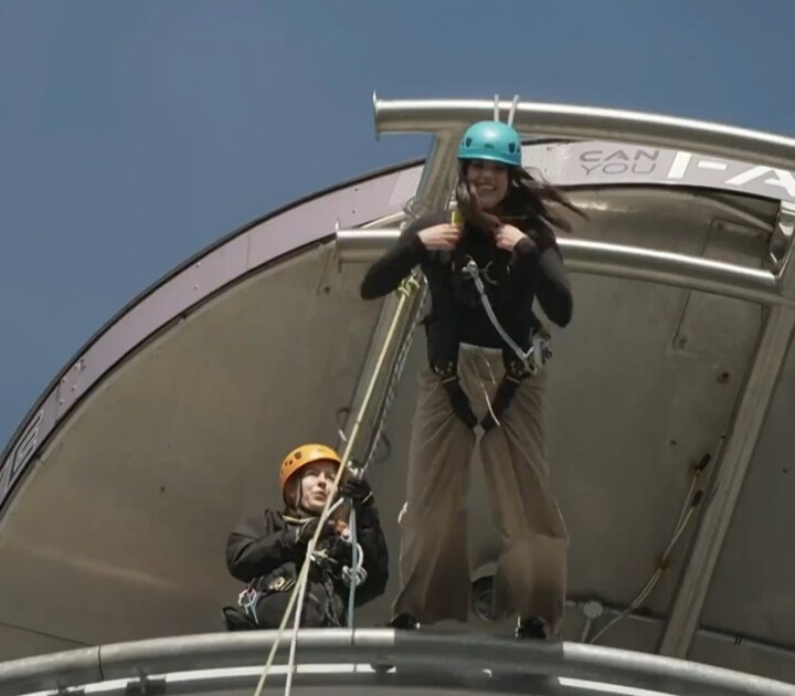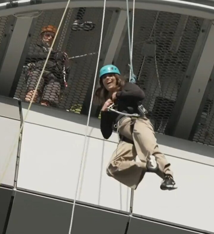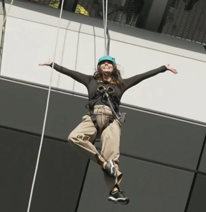 Of course, she was strapped into a harness that kept her safe as she dangled off the side of the ground.