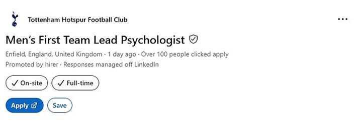 The job listing was posted by Tottenham to social media platform LinkedIn on Tuesday, with the club advertising for a Men's First Team Lead Psychologist.