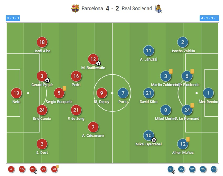 The midfield was pretty standard with no surprises while the front three consisted of Memphis Depay, Antoine Griezmann and Martin Braithwaite. Barcelona were deployed in their traditional 4-3-3 formation.