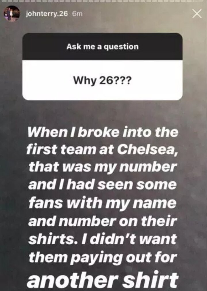 John Terry has endeared himself to Chelsea fans after explaining the reason why he wore the No 26 shirt throughout his career.
