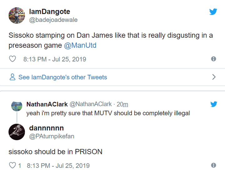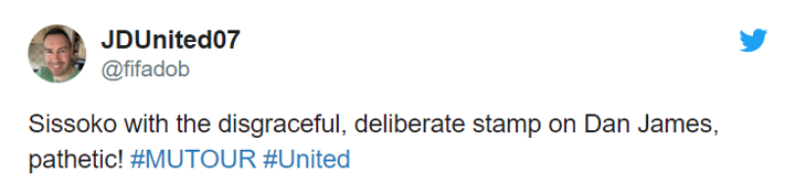 Manchester United fans were furious after watching Moussa Sissoko appear to stamp on Daniel James in their pre-season friendly match.