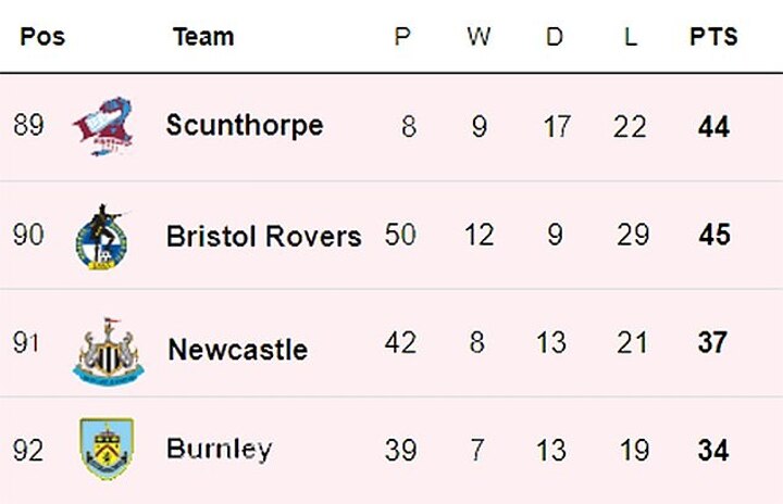 Newcastle fared little better, winning eight of their 42 matches, with a point average of just 0.88.