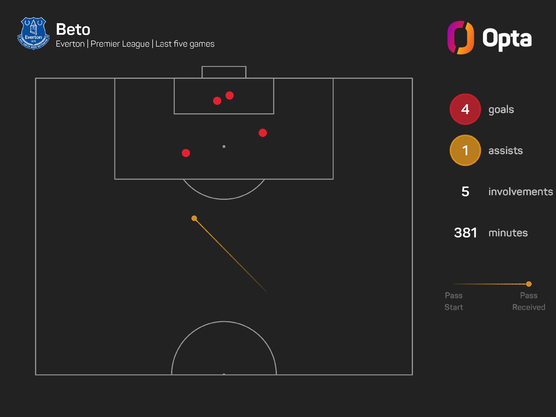 Beto is in excellent form, registering five goal involvements in his last five Premier League appearances (four goals, one assist), with only Bruno Fernandes (seven) involved in more since the start of this run on February 28.