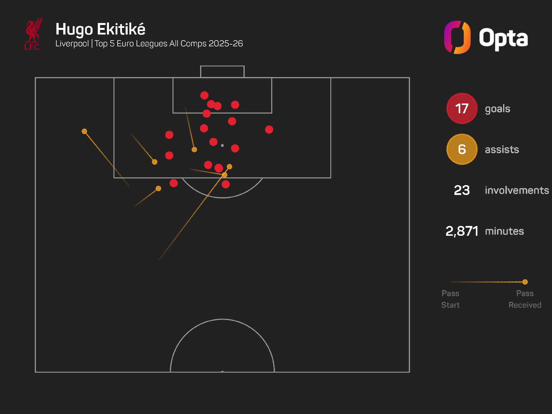 Ekitike's debut campaign at Anfield will end with 17 goals and six assists across all competitions, in 45 matches.