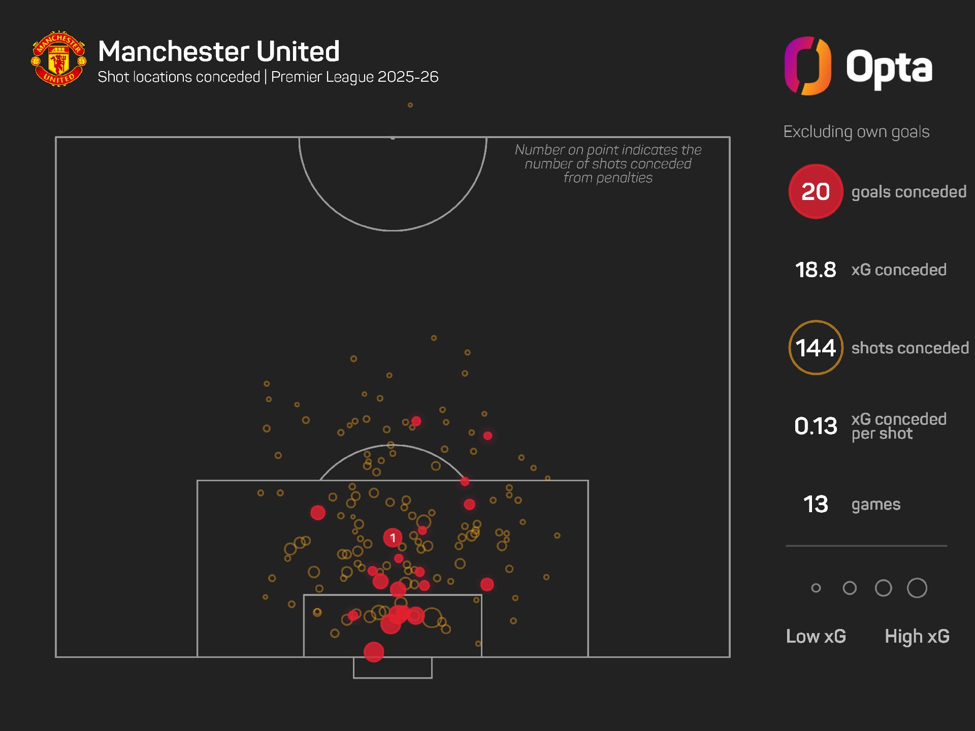 That is United's only shutout in 2025-26 so far, though, and they have conceded 20 goals in 13 matches from 18.8 expected goals against (xGA).