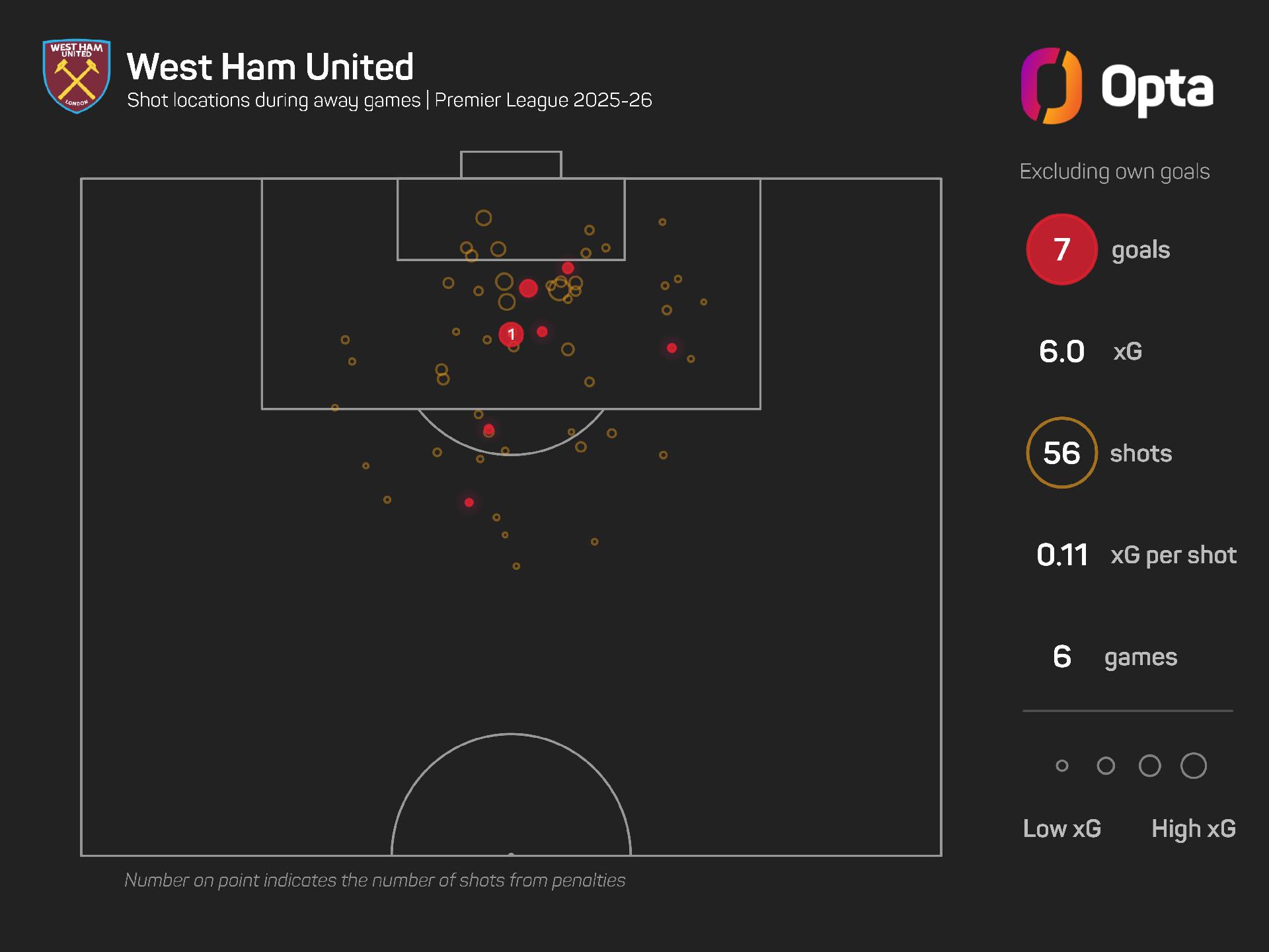 Their total shots (56) are also down on their travels (71 at home), with just 20 of those testing the opposition goalkeeper. Only four West Ham players have had more than one shot on target, with Callum Wilson responsible for seven.