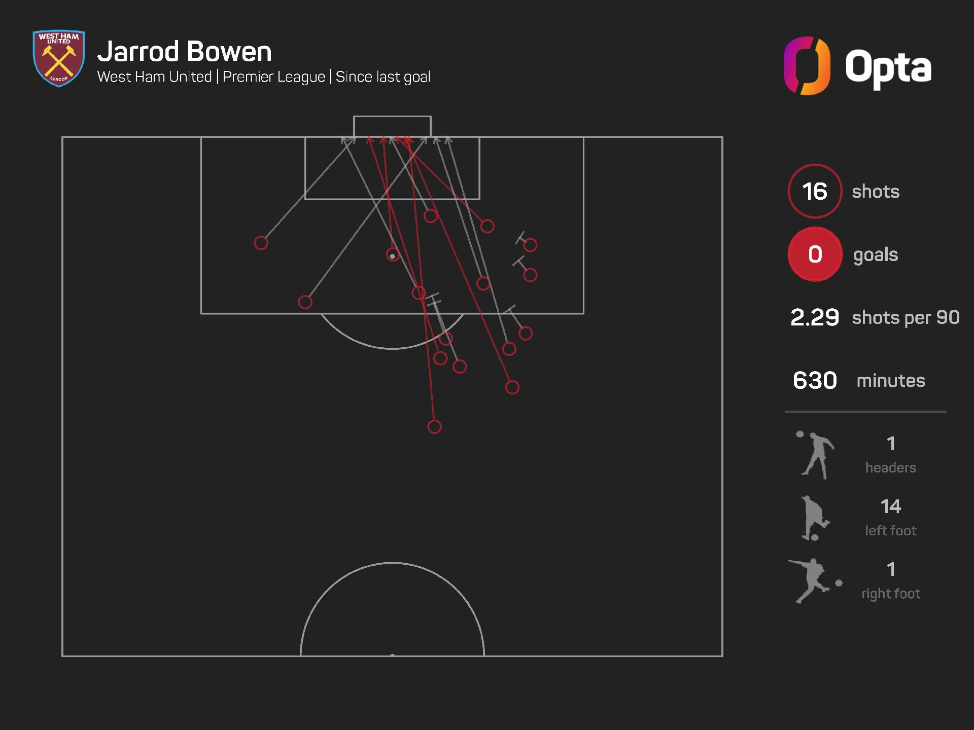 However, Bowen has not hit the back of the net since the end of September, scoring against Everton, and has gone seven games without a goal, despite having 16 shots worth 0.9 (xG) since that game.