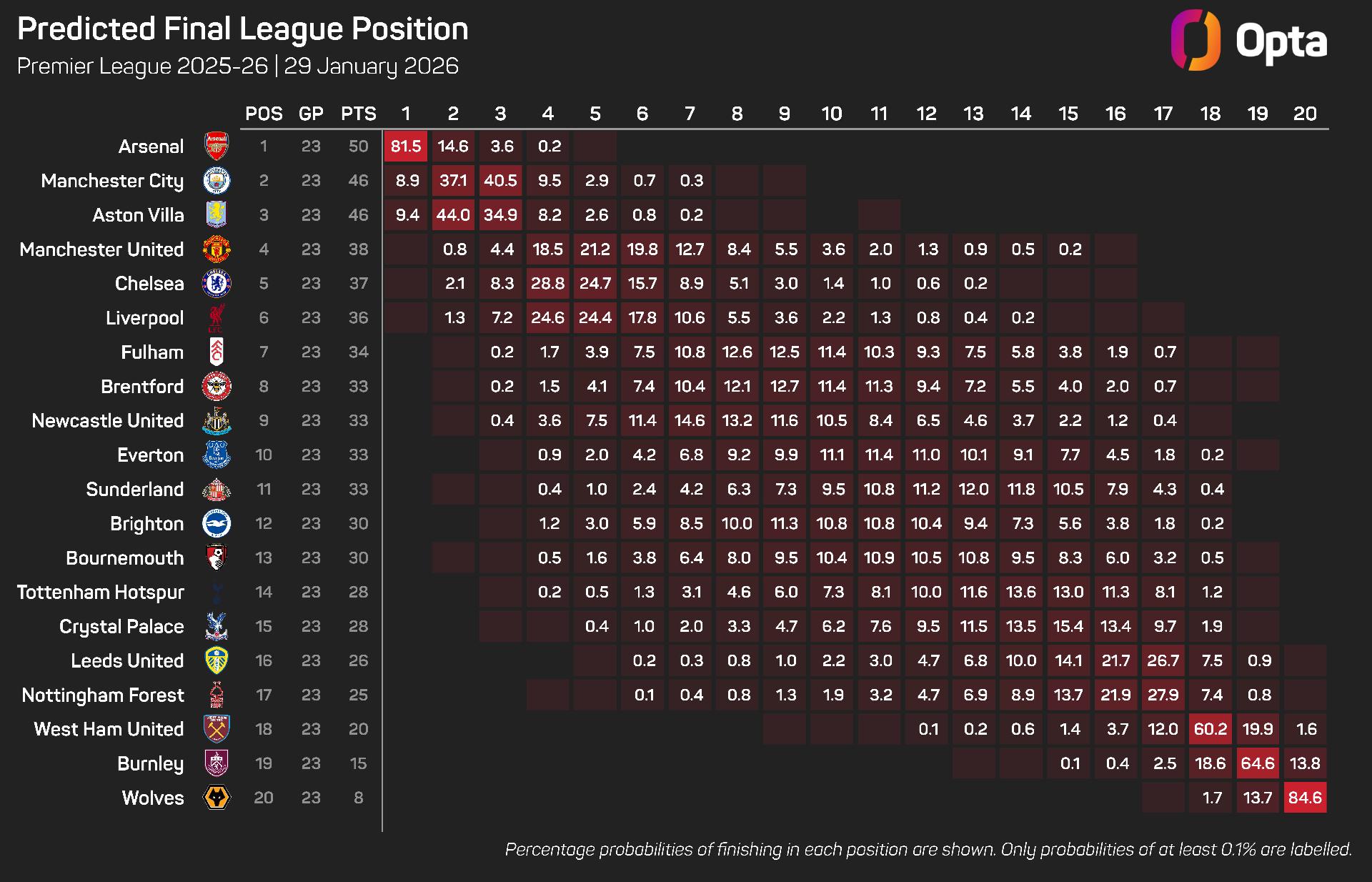 The Gunners took the crown in 81.5% of season simulations, with Villa doing so in 9.4%. Tottenham, meanwhile, finish 14th most often, doing so in 13.6% of scenarios.