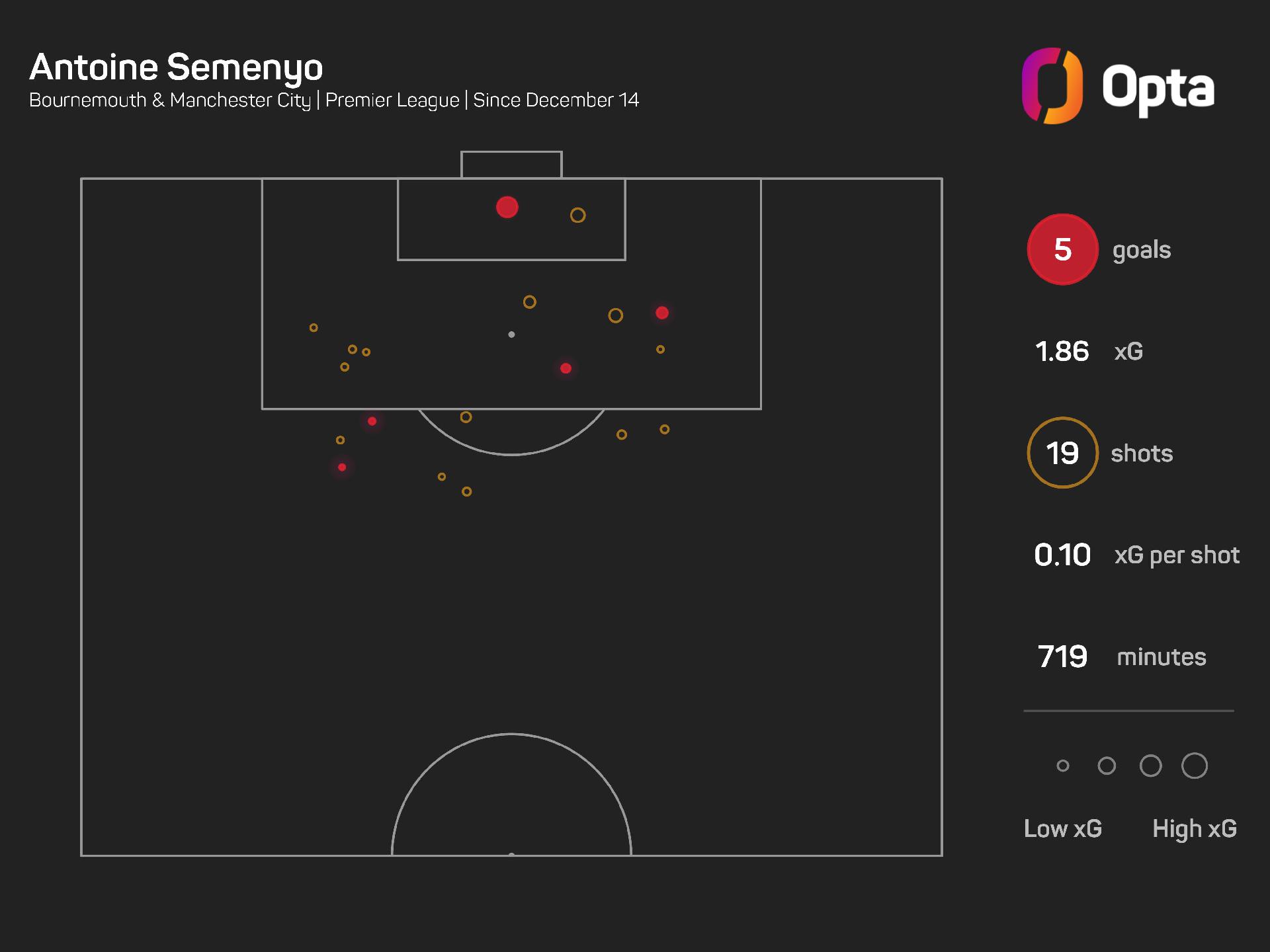Semenyo has scored five goals in his last eight Premier League appearances for both Bournemouth and City, the joint-most of any player in the division since December 15.