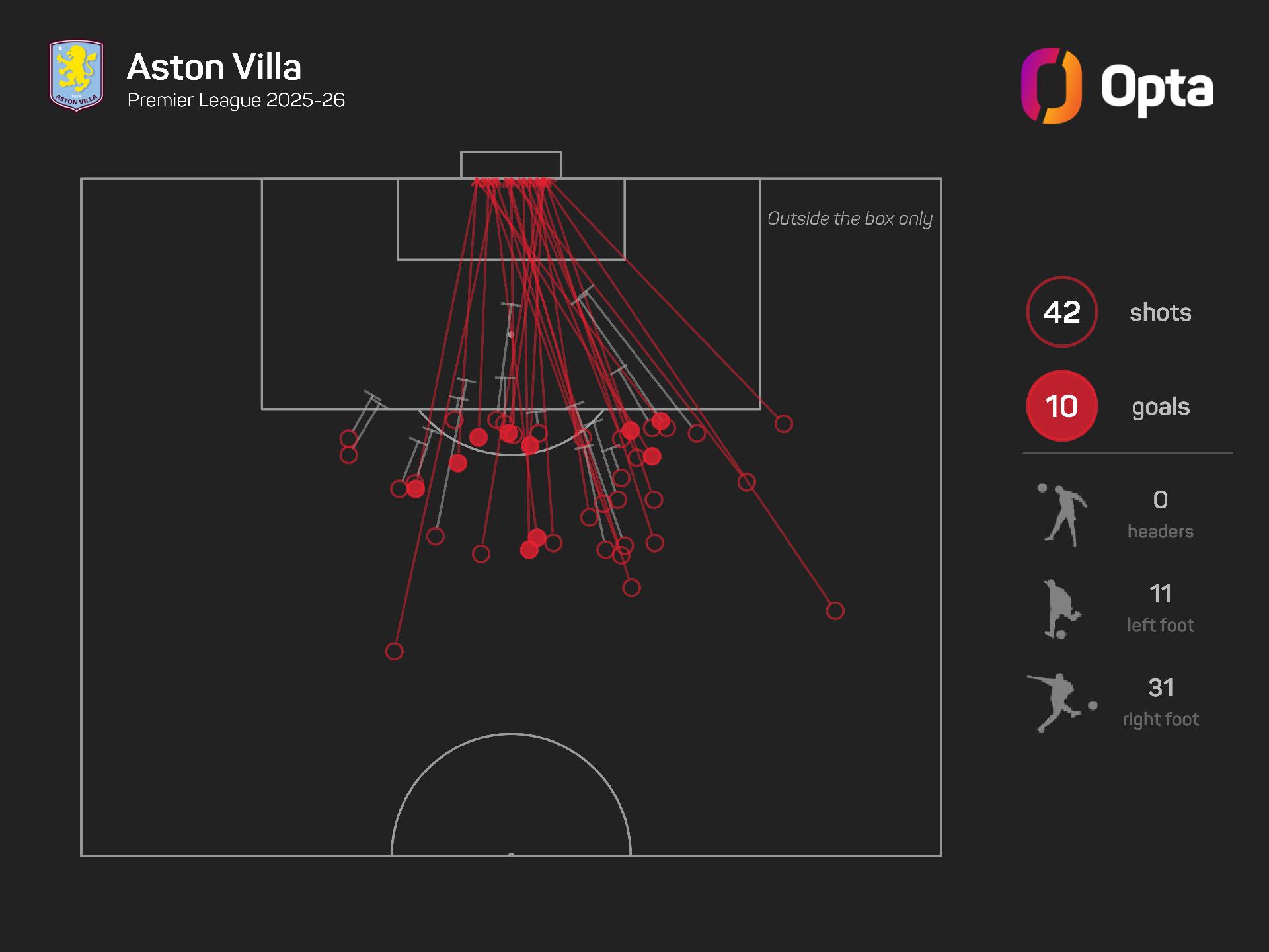 But if Villa continue to defy the statistics, neither Emery nor their fans will care one bit. Villa's overperformance is thanks in large part to the fact they have scored 10 goals from outside the box in the Premier League this season.