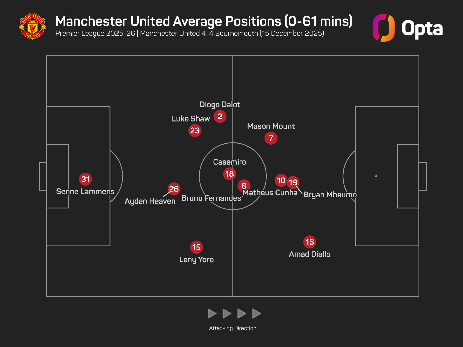 With Luke Shaw, Ayden Heaven and Leny Yoro all starting against the Cherries, United's system appeared to remain the same. Amad pushed far higher than opposite wing-back Diogo Dalot to alter their usual shape.