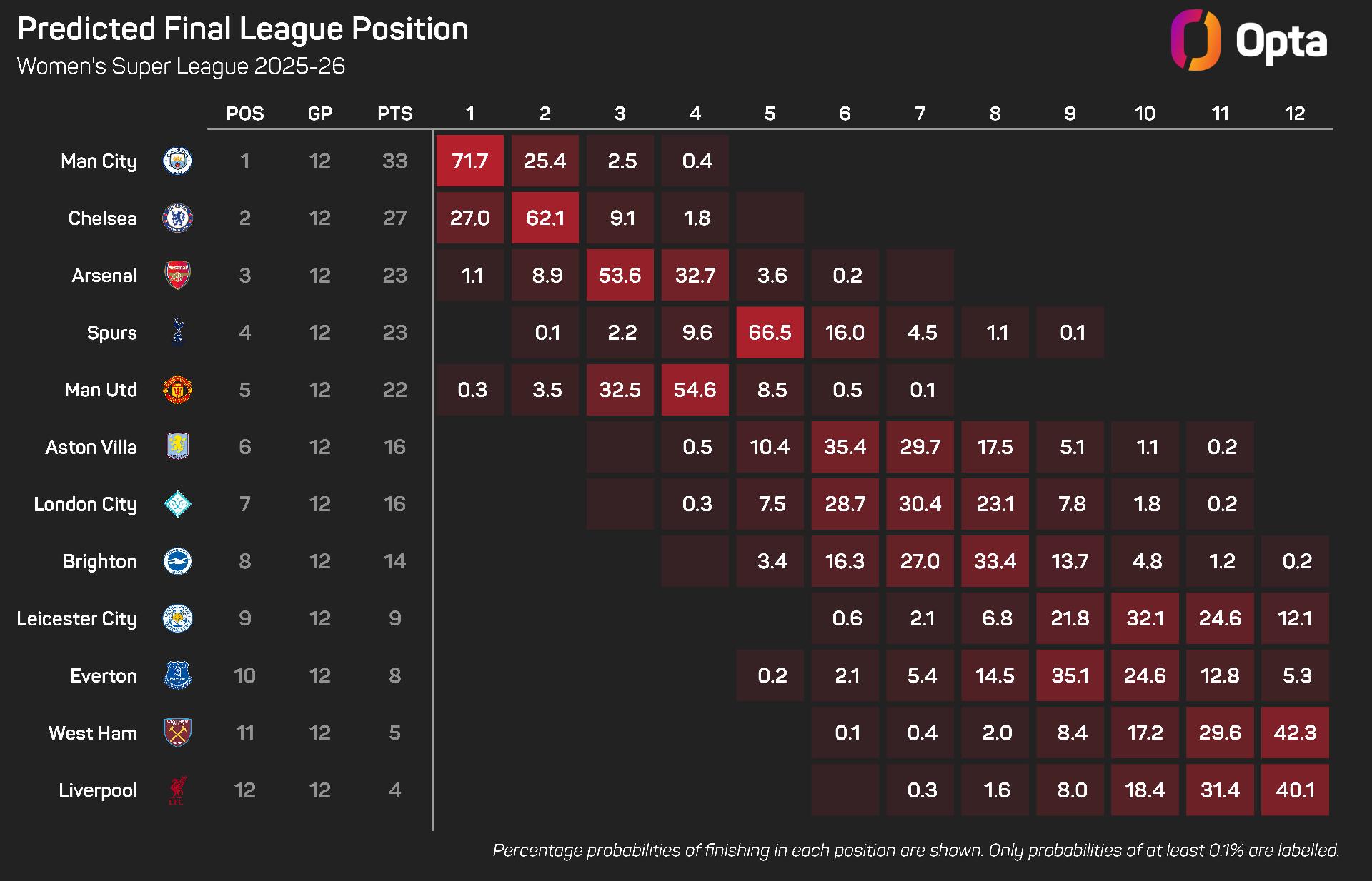 And going into matchday 13, the Opta supercomputer gives Chelsea a 27% chance of retaining their title, with Man City topping the pile in 71.7% of season simulations.