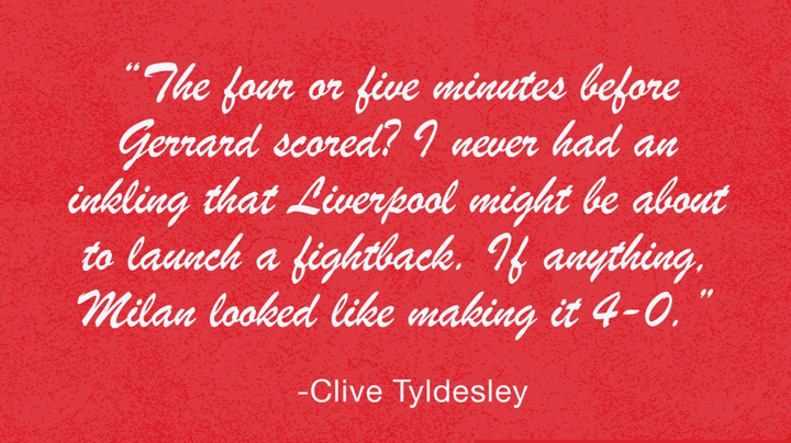 The four or five minutes before Gerrard scored in 2005? I never had an inkling that Liverpool might be about to launch a fightback. If anything, Milan looked like they were going to make it 4-0.