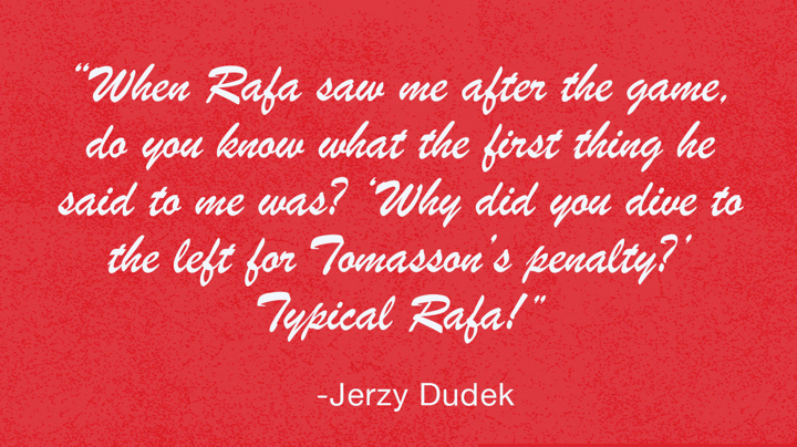 Mind you, Rafa made sure I didn’t get too excited. When he saw me after the game, do you know what the first thing he said to me was? ‘Why did you dive to the left for Tomasson’s penalty?’ Typical Rafa!