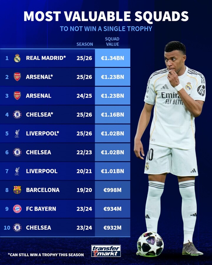 According to Transfermarkt's latest statistics, if they don't win a trophy by the end of the season, Real Madrid's squad in 2025/26 season will be the most expensive squad but winless in trophy across the history. Arsenal, Chelsea and Liverpool from this season are also included, but the Gunners is still chasing their first Premier League title after 22 years.