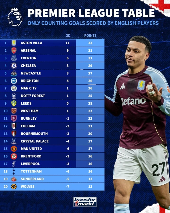 The most reliant on English attackers in PL: Villa top the table, Arsenal in 2nd