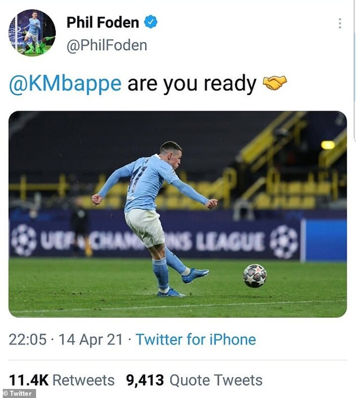 The tweet sent by his social media company in the immediate aftermath of beating Dortmund — seemingly throwing down the gauntlet to Paris Saint-Germain's Kylian Mbappe ahead of the semi-final — did not feel authentically Foden and was not indicative of his personality. It was later deleted after threatening to sour the evening.