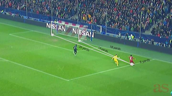 From those figures, we can work out that Salah had a target angle of about 4.3 degrees, meaning that the area that he had to strike for the ball to go in was approximately 1.3 metres, from around 18 yards from goal.
