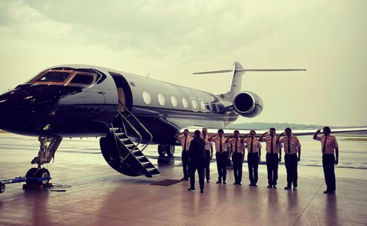 His son has painted a helicopter's interior in the same colour, but his private plane is more discreet in both size and colour.