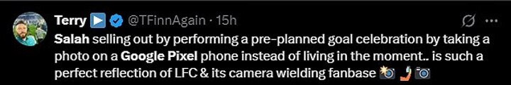 Another wrote: 'Salah selling out by performing a pre-planned goal celebration by taking a photo on a Google Pixel phone instead of living in the moment.. is such a perfect reflection of LFC & its camera wielding fanbase.'