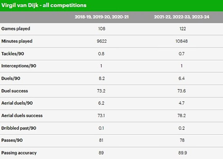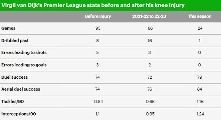 The table below has neatly broken down Van Dijk's key statistics across three separate spells - before his injury, 2021-22 to 2022-23 and this season. Areas such as dribbles, errors, duel success and tackles per 90 were scrutinised in detail.