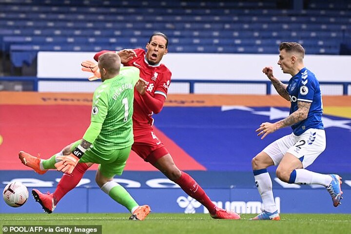 Pickford took off into mid-air and powered through the defender, his studs raised over the ball. Van Dijk collapsed in a heap and was forced out of the Merseyside derby with just 10 minutes on the clock. He would go on to miss almost a year.