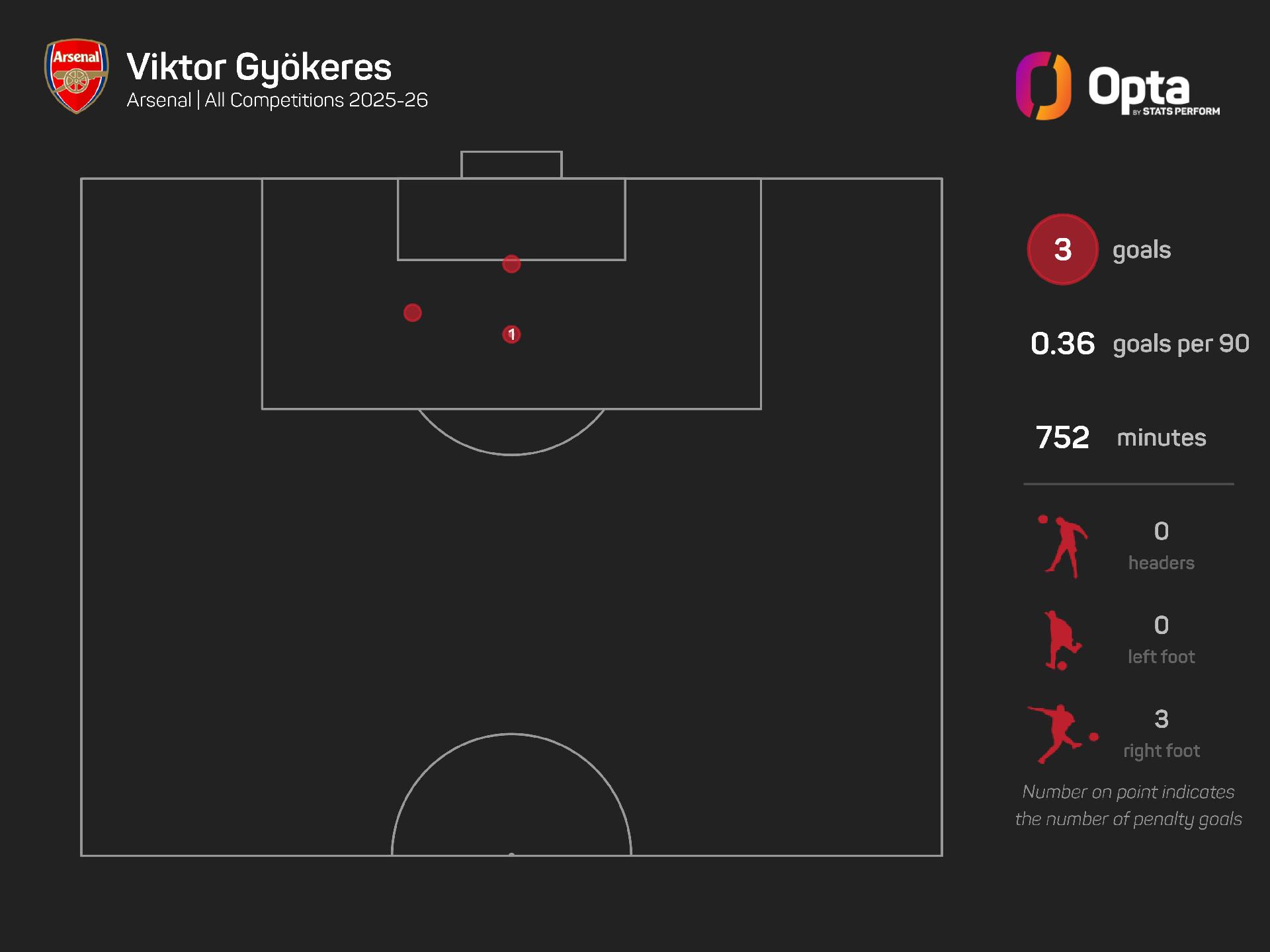 Of players to attempt 15 or more shots in the top-flight in 2025, Gyokeres' expected goals (xG) total of 3.1 is a total only bettered by Manchester City's Erling Haaland (7.8) and Bournemouth's Antoine Semenyo (3.6), proving he is getting the chances to score.