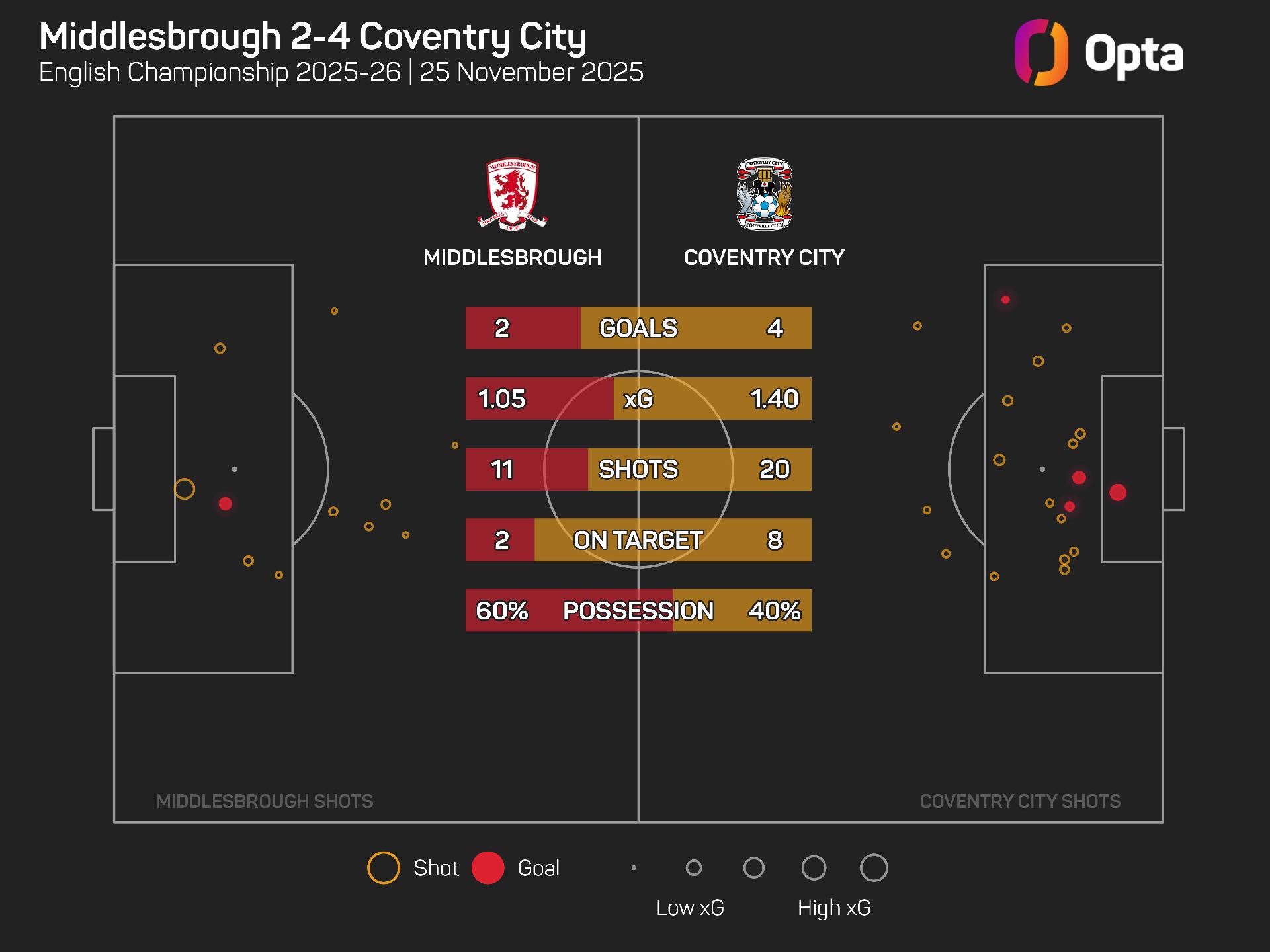 Coventry had 20 shots in total, with eight of those on target, though generated just 1.4 expected goals (xG). Middlesbrough, by contrast, netted with both of their attempts on target.