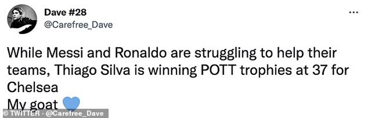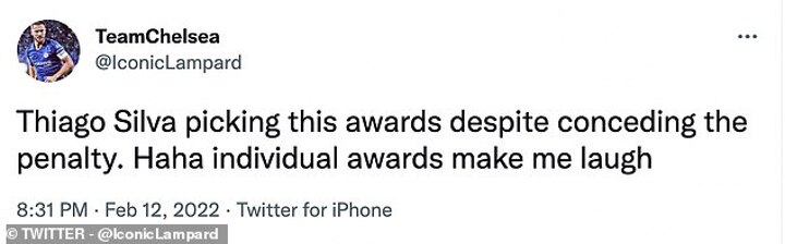 'Thiago Silva picking this awards despite conceding the penalty. Haha individual awards make me laugh,' tweeted @IconicLampard, while another user added: 'Thiago Silva with that experience gave out a cheap penalty'.